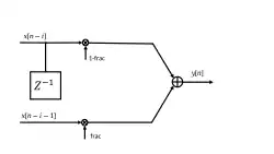 When going back in the time domain exploiting the inverse Z-transform, this corresponds to , where is the Dirac delta. The former equation holds for but for the implementation we need a fractional delay, meaning . In this case, interpolation is required to reconstruct the value of the signal that lies between two samples.[4] One can resort to the preferred interpolation technique, e.g., Lagrange interpolation,[5] or all-pass interpolation.[6]