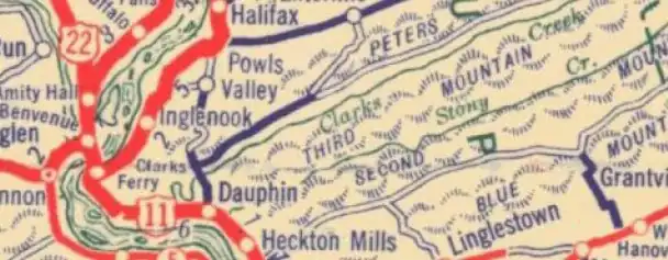 Dauphin is surrounded by Middle Paxton Township, which comprises mountains and valleys south of the confluence of the Susquehanna and Juniata rivers. From south to north, the mountains in the township are Blue Mountain, Second Mountain, Third or Stony Mountain, and Peters Mountain. The eastern ends of these valleys are generally undeveloped state game lands and protected watershed.