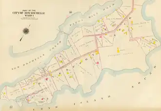 The influx of Huguenot refugees to New York City, following the revocation of the Edict of Nantes, soon made it clear that the projected settlement must be expanded to accommodate many other Huguenots and requiring much more land than was available on the narrow limits of the neck, so a contract to purchase six thousand acres, including the neck, and the balance on the mainland was entered into on July 2, 1687. The several lots on the neck were later bought up by Jacob Leisler and Guillaume LeConte.[3] The neck was first called "Pell's Little Neck," to distinguish it from his larger neck located three miles closer to New York City. After Leisler and Le Conte became the joint owners of the entire neck, it was called "Leisler's and Le Conte's Neck", a name that was retained as late as 1710. Le Conte appears to have taken up his residence on the neck, and the northeasterly promontory, now known as Hudson Park, was known as early as 1703 as "Bonnefoy Point", being named from David Bonnefoy, LeConte's brother-in-law.[4]