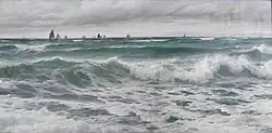 James lived in Plymouth during the 1880s, where he began painting a series of realistic "sea-pieces" from the south-western and southern coasts of England from Cornwall to the Thames.[3] The exact locality is rarely identified by any distinguishing landmarks. The man we know today from his paintings are all in oil, from his time in Cornwall and Devon, concentrating on the painting of coastal scenes and the sea itself. Today, he is best known for his large pictures of breaking waves.