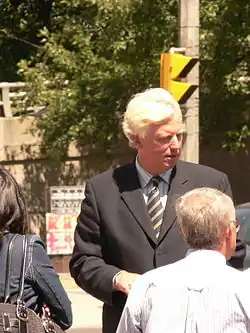 Miller's plans to run for mayor were well-known around city hall in 2002, and there was little surprise when he formally declared his candidacy in January 2003.[32] His earliest supporters included councillors Howard Moscoe, Sandra Bussin, Irene Jones and Anne Johnston and urban planner Jane Jacobs.[33] He was later endorsed by councillors Olivia Chow, Joe Pantalone and Brian Ashton, public figures such as June Callwood, Judy Rebick, Margaret Atwood, Michael Ondaatje and Michele Landsberg, American environmental activist Robert F. Kennedy Jr., the Canadian Union of Public Employees (CUPE) and the Toronto Professional Fire Fighters Association.[34] Toronto Star columnist Royson James and councillors Raymond Cho and Michael Walker also endorsed Miller near the end of the campaign.[35]