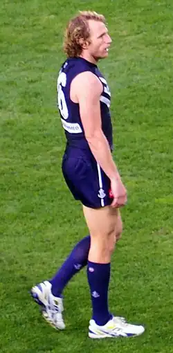 2010 was his best season to date, and he was recognised by being named in the 40-man squad for the 2010 All-Australian team[5] and also won the Doig Medal as Fremantle's best player for the year.[6] At the end of the 2010 season, there was much speculation that Mundy would not renew his contract with Fremantle and would instead either return to play in Melbourne, or be recruited by the new Gold Coast Football Club.[7] However, he rejected all other offers and re-signed with Fremantle in September 2010 for an additional four years.[8] He then later re-signed at the end of 2014 for another 3 years.[9]