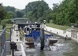 There are navigation transit markers upstream of the lock to allow boats to check their speed. A powered boat should take more than one minute to pass between the markers.