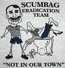 "Scumbag Eradication Team: Not in our Town!" are the words printed on a T-shirt used to raise money for the Daytona Beach Police Explorers Unit 22, a program which helps to mentor teenagers age 14–19 who are interested in a career in law enforcement.