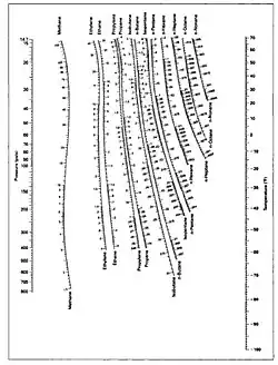 DePriester Charts provide an efficient method to find the vapor-liquid equilibrium ratios for different substances at different conditions of pressure and temperature. The original chart was put forth by C.L. DePriester in an article in Chemical Engineering Progress in 1953. These nomograms have two vertical coordinates, one for pressure, and another for temperature. "K" values, representing the tendency of a given chemical species to partition itself preferentially between liquid and vapor phases, are plotted in between.[1][2][3][4] Many DePriester charts have been printed for simple hydrocarbons.[5][6]
