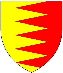 Abandoned the de Birmingham's traditional coat of arms and replaced it with:- partie per pale, indented, or, and gules.[11]