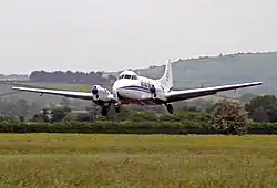 The development team for the Dove was headed by Ronald Bishop,[2] the creator of the de Havilland Mosquito, a wartime fighter-bomber, and the de Havilland Comet, the first commercial jet aircraft in the world. It had been developed to meet the Type VB requirement issued by the Brabazon Committee.[3] In concept, the Dove was developed to be the replacement of the pre-war Dragon Rapide.[2] It was also required to be competitive with the large numbers of surplus military transports in the aftermath of the Second World War, such as the Douglas DC-3.[4] Unlike the Dragon Rapide, the Dove's structure was entirely metal.[5][6] It featured innovations including constant-speed propellers, flaps, and a retractable tricycle undercarriage.[7][2]