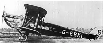 The DH.54 Highclere[1] was designed to Air Ministry specification 40/22 for a larger version of the very successful DH.34 and the two aircraft had much in common, both in construction and general layout. Compared with the DH.34, the Highclere's passenger complement increased from nine to twelve, its all-up weight by 56% and its wing area by 70%. They were both single-engined two-bay biplanes with fabric-covered wooden wings and with wooden-framed fuselages covered with thin plywood.[1]