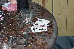 The expression "dead man's hand" appears to have had some currency in the late 19th and early 20th centuries, although no one connected it to Hickok until the 1920s.[1][2] The earliest detailed reference to it was 1886, where it was described as a "full house consisting of three jacks and a pair of tens" ( ).[3] Three jacks and red sevens ( 7♥ 7♦) are called the dead man's hand in the 1903 Encyclopaedia of Superstitions, Folklore, and the Occult Sciences.[4] The 1907 edition of Hoyle's Games refers to the hand as jacks and eights ( ).[5]