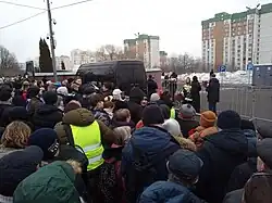 On 27 February, Kira Yarmysh said that they were trying to find a place to hold a public memorial for Navalny, adding that most funeral locations they had contacted had refused to allow a ceremony on their premises. On the same day, Vasily Dubkov, one of Navalny's lawyers who accompanied Lyudmila Navalnaya in retrieving her son's remains in Yamalo-Nenets, was reportedly arrested in Moscow on charges of "violating public order".[63] On 28 February, Yarmysh announced that Navalny would be buried in the afternoon of 1 March at the Borisovskoye Cemetery, following a service at the Church of the Icon of the Mother of God Soothe My Sorrows in Moscow's Maryino District, where Navalny previously resided.[64] Ivan Zhdanov, a director of the Anti-Corruption Foundation, said that the funeral had initially been scheduled on 29 February but was moved after no venue agreed to hold it on that day, which coincided with Putin's annual Presidential Address to the Federal Assembly. He added that Navalny's relatives were being pressured by authorities to conduct a "quiet family funeral."[11]