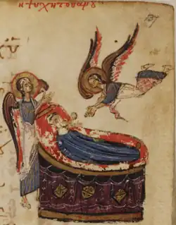 For most Byzantines, the arrival of a priest was a sure sign of the near end and a signal to begin mourning.[48] Although Byzantines prayed for a peaceful end to their lives, popular belief held that the soul left the body after a fierce struggle (psychomachia). The dying person was said to have terrifying visions of angels and demons judging his or her past life. It was believed that the soul was weighed on scales at the moment of death, and Eustathius of Thessalonica, commenting on the works of Homer in the 12th century, called the expression "lying on the scales of Hades" a popular synonym for the word "death".[51] Later church paintings often depict the deceased accompanied by the archangel Michael, who plays the role of psychopomp.[52] Speculation about the afterlife was mostly the prerogative of monks, who were considered experts in eschatological matters. In hagiographical literature, it is common to find monks gathered around a dying brother who recounts his death visions.[53]