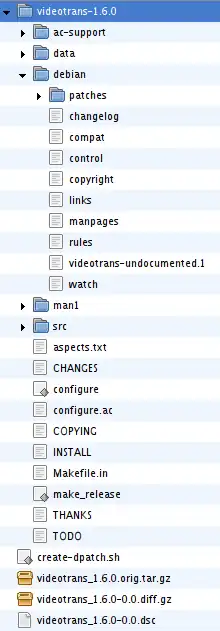 orig.tar) — a mere copy of the upstream source tarball if it is intarformat and no changes are necessary, or a repacked tarball. The latter can happen if it contains a snapshot from a version control system that was never released in tarball form, or if the maintainer needs to remove files not compatible with the Debian Free Software Guidelines. - The