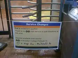 By the storm's end, weather stations in Central Park had recorded 20 inches (51 cm) of snow. A combination of heavy snow and strong winds led to massive transportation lockdowns across the city. Nearly all roads in the city (with the exception of major arteries) were left impassable for many days because of the amount of snow. Hundreds of buses were stuck in the snow.[27] More than 400 passengers were stranded on the A train on the IND Rockaway Line for seven hours starting shortly before 1 a.m.[28] One train did not open its doors when it stopped at the station. Dozens of LIRR trains were frozen onto the platforms. Hundreds of plows were on the road. NYC's major airports, Kennedy, Newark and LaGuardia were shut down until 6:00 p.m. Monday evening.[29] The MTA ran on a limited schedule, even on Tuesday morning, with many above ground subway lines not functioning. By Wednesday, only the Sea Beach Line, Franklin Avenue Line, and Greenport Branch remained suspended. The subway resumed full service on Thursday, the LIRR Friday morning.
