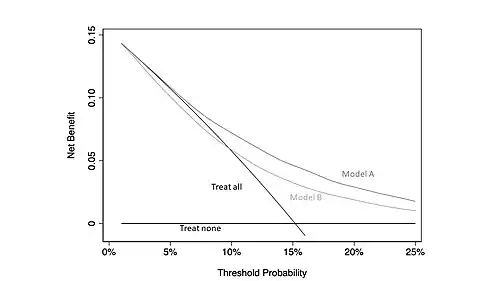A decision curve analysis graph is drawn by plotting threshold probability on the horizontal axis and net benefit on the vertical axis, illustrating the trade-offs between benefit (true positives) and harm (false positives) as the threshold probability (preference) is varied across a range of reasonable threshold probabilities.[2]