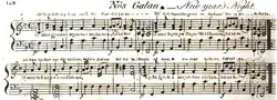 The tune is that of an old Welsh air, first found in a musical manuscript by Welsh harpist John Parry dating back to the 1700s. He published it in British Harmony Being a Collection of Antient Welsh Airs The traditional Remains of those Originally Sung By the Bards of Wales.[17] Poet John Ceiriog Hughes later wrote his own lyrics. A middle verse was later added by folk singers. In the eighteenth century the tune spread widely, with Mozart allegedly using it in his 18th violin sonata (1778)[18] and later Haydn arranged it in under the Welsh title, "Nos galan" (Hob. XXXIb: 29, 1803).