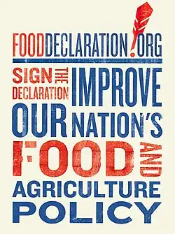 The Declaration for Healthy Food and Agriculture (also known as the Food Declaration) is a declaration, endorsed by 200 national leaders of the slow food movement, outlining 12 principles that these leaders believe should frame a healthy food and agriculture policy.[1] Initiated by Roots of Change (a San Francisco-based non-profit organization) and developed by a national team of thinkers, producers and activists, the stated goal of the declaration is to promote food and agriculture policies that benefit all Americans. It was launched at the 2008 Slow Food Nation event at San Francisco City Hall.