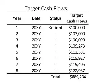While most of the original work on dedicated portfolios was done for large institutional investors such as pension funds, the most recent applications have been in personal investing. This example is a couple who wants to retire this year (call it 20XY, such as 2018) and has already set aside cash to cover their expenses. Social security will supply some income, but the rest will have to come from their portfolio. They have accumulated a retirement portfolio worth $2,000,000 in addition to this year's expenses. Typically, retirement portfolios have a higher percentage of bonds in their portfolio than portfolios owned by younger people who are not yet approaching retirement. Probably the most common retirement portfolio would be a 60/40 stock/bond allocation compared to an 80/20 or 90/10 stock/bond allocation for younger investors. Following a common rule of thumb for retirement withdrawal rates to make a retirement portfolio last at least 30 years, they should withdraw no more than 5 percent from their portfolio next year ($100,000). They can increase it each year by the amount of the previous year's inflation. To be conservative, they will plan for an annual inflation rate of 3 percent (they may not spend it, but want the protection just in case). Table 1,[note 1] lists the projected stream of withdrawals. These withdrawals represent the yearly “income” the couple needs for living expenses over their first eight years of retirement. Note that the total cash flow needed over the entire eight years sums to $889,234.