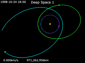 ![]() Artist concept of Deep Space 1 firing its ion thrusters | |||||||||