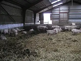 Deep litter is an animal housing system, based on the repeated spreading of straw or sawdust material in indoor booths.[1] An initial layer of litter is spread for the animals to use for bedding material and to defecate in, and as the litter is soiled, new layers of litter are continuously added by the farmer.[2] In this fashion, a deep litter bedding can build up to depths of 1–2 meters.[3] "The usual procedure for built-up floor litter is to start with about 4 inches (100 mm) of fine litter material with additions of 1 to 2 inches (25 to 50 mm) later as needed without removal of the old. A depth of 6 to 12 inches (150 to 300 mm) is maintained by partial removals from time to time."[4] Many consider this to be a natural means to disposing of animal feces. "The deep litter cultivation is a modern ecological breeding technique based on decomposing feces by microbiological methods, a post processing method for poultry Manure."[5]