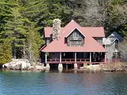Skull and Bones doesn't own an opulent island hideaway like the one depicted in The Skulls. It does own an island on the St. Lawrence River — Deer Island, in Alexandria Bay. The forty-acre retreat is intended to give Bonesmen an opportunity to "get together and rekindle old friendships". A century ago the island sported tennis courts and its softball fields were surrounded by rhubarb plants and gooseberry bushes. Catboats waited on the lake. Stewards catered elegant meals. But although each new Skull and Bones member still visits Deer Island, the place leaves something to be desired. "Now it is just a bunch of burned-out stone buildings," a patriarch sighs. "It's basically ruins." Another Bonesman says that to call the island "rustic" would be to glorify it. "It's a dump, but it's beautiful." The fading of Deer Island exemplifies the dwindling finances of Skull and Bones, which can no longer claim the largest society endowment at Yale. Unlike members of other societies, Bonesmen pay no dues, though patriarchs receive an annual letter requesting a "voluntary contribution to the Russell Trust Association." In truth, Skull and Bones has never been wealthy.[1]