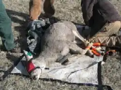 Deer hunting is a practice employed to regulate the population of deer. Hunting is a form of predation in which the deer are a food source or a trophy. Deer hunting is conducted in seasons that are regulated by government agency with tag limits for both bucks and does. Deer hunting can be conducted using a bow and arrow, rifle, muzzle loader or other approved weapons.[9] Hunting is only an effective method of population control when antlerless deer are targeted. The hunting of bucks has little impact on the population over time because one buck is able to breed numerous does. Currently, hunting targeting antlerless deer is considered the most effective form of population control.[10]