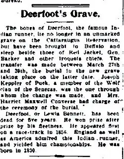 - ^ "Deerfoot, the Fleet, Is No More; Noted Indian Runner Dies on the Cattaraugus Reservation". The New York Times. January 20, 1896. p. 1. Retrieved June 19, 2020.