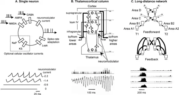 The Dehaene–Changeux model is a meta neural network (i.e. a network of neural networks) composed of a very large number of integrate-and-fire neurons programmed in either a stochastic or deterministic way. The neurons are organised in complex thalamo-cortical columns with long-range connexions and a critical role played by the interaction between von Economo's areas. Each thalamo-cortical column is composed of pyramidal cells and inhibitory interneurons receiving a long-distance excitatory neuromodulation which could represent noradrenergic input.