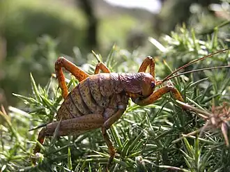 Deinacrida mahoenui, the Mahoenui giant wētā, is a flightless insect in the giant wētā family Anostostomatidae. It is endemic to the area of Mahoenui, New Zealand, and the world population for some time was restricted to a single patch of introduced gorse on farmland.