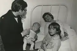 Piedad laying on a hospital bed next to a surviving sister, talking with journalist Francisco Umbral.