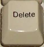 The key appears on English-language IBM-compatible PC keyboards labeled as Delete or Del, sometimes accompanied by a crossed-out right-arrow symbol.[1][2] A dedicated symbol for "delete" exists as U+2326 ⌦ but its use as a keyboard label is not universal. However, sometimes the key labelled Delete performs the Backspace function instead, for example on some Apple keyboards.[3]