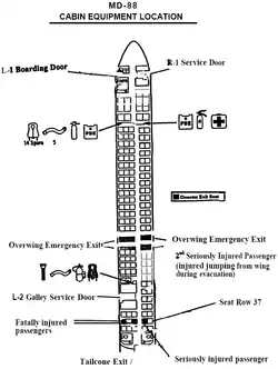 At 2:27 pm CDT, the pilot requested emergency medical assistance after learning of the large hole in the fuselage, engine debris throughout the cabin and injured passengers. He then reported that there was no evidence of smoke or fire in the cabin and that the rear-cabin door had been opened and the emergency slide was inflated. The flight attendant who initiated the evacuation through the door told the NTSB that she saw fire on the left engine and therefore abandoned evacuation through that door and directed passengers forward. She reported that as there were many injuries and possibly two dead, she began to evacuate the plane until she was stopped by the first officer. Because of the damage to the rear of the aircraft, the plane's stairs were found unsuitable for use. The captain requested portable air stairs, which arrived 25 minutes later.[3] Many passengers escaped through the emergency exits over the wings and then jumped to the ground or slid down chutes.[5]