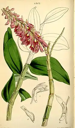 Dendrobium secundum, also known as the toothbrush orchid, is a species of flowering plant in the genus Dendrobium of the family Orchidaceae. The common name refers to the fact that all the flowers are on the same side of the stem, much like the bristles all on one side of a toothbrush.[3]