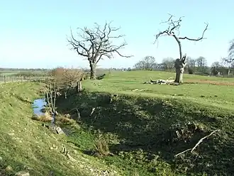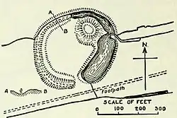 Denham Castle was a 12th Norman castle, built in a motte and bailey design with the motte (man-made hill), now 10 feet high, located in the north-east corner.[2] The motte and the bailey (courtyard) are contained within a wide ditch, 132 m by 122 m across.[3] The entrance to the castle was on the south side.[2]