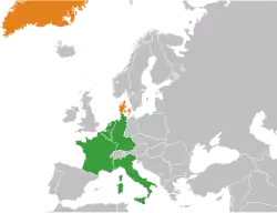 Denmark formally applied to join the European Communities, the predecessor of the European Union, on 10 August 1961, a day after the British applied.[6] However, the then President of France Charles de Gaulle vetoed British membership, and Denmark did not wish to join the EC without the United Kingdom.[7] After much negotiation, and following a change in the French presidency, Denmark, Ireland and the United Kingdom eventually joined the European Communities on 1 January 1973. Denmark and Ireland were so economically linked to the UK that they considered it necessary to join the EC if the UK joined it.[8] The Danish population voted for membership, 63.3% being in favour, with a turnout of 90.1%.[9] This was the first of several enlargements which became a major policy area of the Communities.[10] In 1982, Greenland voted to leave the Communities after gaining home rule from Denmark.[11]