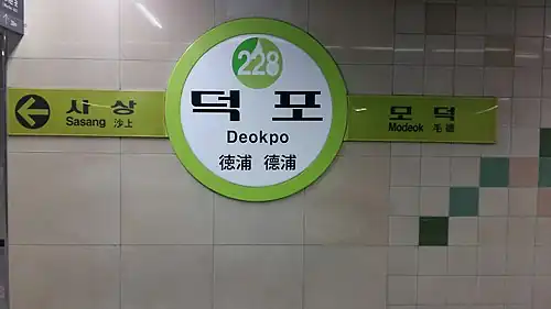 Deokpo Station (Korean: 덕포역) is a station on the Busan Metro Line 2 in Deokpo-dong, Sasang District, Busan, South Korea.
