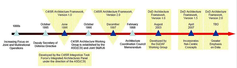 The first version of the development DoDAF was developed in the 1990s under the name C4ISR Architecture Framework. In the same period the reference model TAFIM, which was initiated in 1986, was further developed. The first C4ISR Architecture Framework v1.0, released 7 June 1996, was created in response to the passage of the Clinger-Cohen Act. It addressed the 1995 Deputy Secretary of Defense directive that a DoD-wide effort be undertaken to define and develop a better means and process for ensuring that C4ISR capabilities were interoperable and met the needs of the warfighter. Continued development effort resulted in December 1997 in the second version, C4ISR Architecture Framework v2.0.[1]