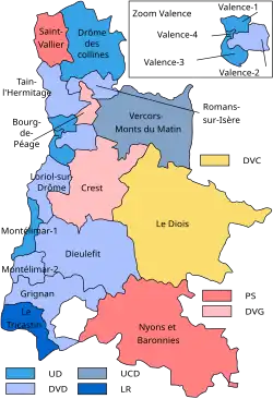 The departmental council of Drôme includes 38 departmental councilors elected from the 19 cantons of Drôme.