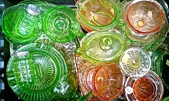 Depression glass is glassware made in the period 1929–1939, often clear or colored translucent machine-made glassware that was distributed free, or at low cost, in the United States and Canada around the time of the Great Depression. Depression glass is so called because collectors generally associate mass-produced glassware in pink, yellow, crystal, green, and blue with the Great Depression in America.[1]