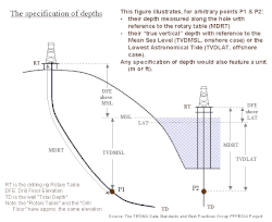 and none of these three components should ever be left implicit. Example: the top of a reservoir may be found at 1,500 mMDRT in a particular well (1,500 m measured depth below the rotary table), which may be equal to 1,492 mTVDMSL (1,492 m true-vertical-depth below mean sea level) after correction for deviations from vertical.