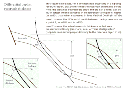 Specification of a differential depth or a thickness: in Figure 2 above, the thickness of the reservoir penetrated by the well might be 57 mMD or 42 mTVD, even though the reservoir true stratigraphic thickness in that area (or isopach) might be only 10 m, and its true vertical thickness (isochore), 14 m.