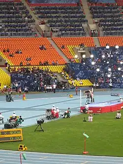 He competed in the high jump event at the 2012 Summer Olympics after winning the Canadian national championships with a 2.31 to edge out compatriot Michael Mason who also competed in London.[13] Drouin was almost unable to get to the point where he could compete at the Olympics, having torn three ligaments in his foot in 2011 after jumping in a meet in Mississippi State and only returned to competition in April 2012.[8] In two Diamond League meets in London and Monaco before the Olympics, Drouin won and finished third with a 2.26 and 2.30 for each respective meet.[14] Drouin initially won the bronze medal at the 2012 Summer Olympics in London, England with a jump of 2.29 metres.[11][15] This was Canada's first medal in high jump since the 1976 Summer Olympics in Montreal when Greg Joy medalled for Canada.[11] His medal was retroactively upgraded to silver in 2021 when the original winner Ukhov of the event was disqualified.[6]