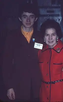 World tour as a chorister with the 40-voice Auckland University Festival Choir,[40][41] conducted by Professor Peter Godfrey, a King's College, Cambridge alumnus and founder of the New Zealand Choral Federation and the Symphonia of Auckland.[42] During the 3rd International University Choral Festival, at the United Nations, the choir participated in a massed chorus of 16 international choirs conducted by Willi Gohl,[43][44] followed by a concert of 640 voices on 30 April 1972 at the Lincoln Center for the Performing Arts[45] New York under Robert Shaw.[46][47] During the US tour, the choir also performed at the John F. Kennedy Center for the Performing Arts and at a White House reception with the First Lady, Pat Nixon,[20][48] on the eve of the breaking of the Watergate scandal. In the United Kingdom, the Festival Choir performed at Westminster Abbey and at King's College, Cambridge in a joint concert with King's College Choir with Sir David Willcocks. They were met by composer Benjamin Britten and tenor Peter Pears for the choir's recital at the Snape Maltings[49]: 33 [50][51] and the choir won praise[52] for its performances in the Netherlands, Germany, Switzerland and Singapore. In 1998, there was a CD re-release[53] of its LP, recorded straight after the world tour.[54] Lauded as the "best choir New Zealand has produced",[55] Godfrey's Festival Choir continued to hold decennial reunions until his death in 2017.[56]