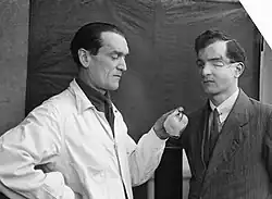 As the onset of the First World War, Wood was too old (at 41), for active duty and enlisted as a private in the Royal Army Medical Corps, in which he served as an orderly with his photographer friend Ward Muir. He worked as an orderly in hospital wards, and his exposure to the gruesome injuries inflicted by the new war's weapons eventually led him to open a special clinic: the Masks for Facial Disfigurement Department, located in the Third London General Hospital, Wandsworth. Instead of the rubber masks used conventionally, Wood constructed masks of thin metal, sculpted to match the portraits of the men in their pre-war normality. Just as had been happening with soldiers operated upon with the recent advances in plastic surgery, Wood's masks provided each with a renewed self-confidence, even self-respect, though they often proved uncomfortable. Face wounds were known to be the most devastating. By hiding the wounds behind the mask, the young men were able to return to relationships with their families and friends.[4]