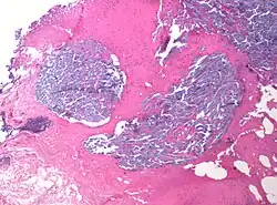 Desmoplasia refers to growth of dense connective tissue or stroma.[2] This growth is characterized by low cellularity with hyalinized or sclerotic stroma and disorganized blood vessel infiltration.[3] This growth is called a desmoplastic response and occurs as result of injury or neoplasia.[2] This response is coupled with malignancy in non-cutaneous neoplasias, and with benign or malignant tumors if associated with cutaneous pathologies.[3]