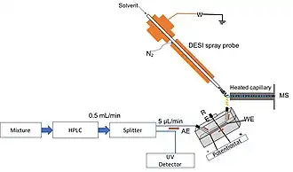 DESI can be coupled to ultra-fast liquid chromatography using an LC eluent splitting strategy. It is a strategy through a tiny orifice on an LC capillary tube. There is negligible dead volume and back pressure that allows for almost real time mass spectrometry detection with a fast elution and purification.[22] This coupling can be used to ionize a wide range of molecules, from small organics to high mass proteins. This is different from ESI (electrospray ionization) in that it can be used to directly analyze salt-containing sample solutions without requiring “make-up” solvents/ acids to be doped into the sample.[23] This set up allows for a high flow rate without splitting. The high resolution that is accomplished by reverse-phase HPLC can be combined with this procedure to produce high throughput screening of natural products as well.[24] The incorporation of the electrochemistry component helps with ionization efficiency via the electrochemical conversion.[25] This method is proved better than ESI in the fact that you don't have to separate the small potential that is applied to the cell from the potential on the spray in DESI. DESI also shows a better tolerance to inorganic salt electrolytes and you can use traditional solvents used in electrolysis.[24]