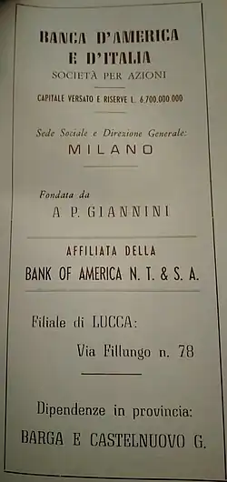 Banca dell'Italia Meridionale[2] was found in 1917.[3] It was acquired by Amadeo Giannini, the founder of Bank of Italy (United States) in 1922.[4] The bank was renamed to Banca d'America e d'Italia (literally the Bank of America and Italy). In December 1986 Deutsche Bank acquired 98.3% voting rights of the bank.[3]: 71 In 1994 the bank was renamed to Deutsche Bank S.p.A..[2]