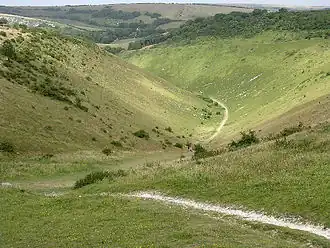 Devil's Dyke is a 100-metre (330 ft) deep V-shaped dry valley on the South Downs in Sussex in southern England, 5 miles (8.0 km) north-west of Brighton. It is managed by the National Trust, and is also part of the Beeding Hill to Newtimber Hill Site of Special Scientific Interest.[1] Devil's Dyke was a major local tourist attraction in the late 19th and early 20th centuries. It is now a popular viewpoint and site for walking, model aircraft flying and hang gliding.[2] The South Downs Way passes the site.