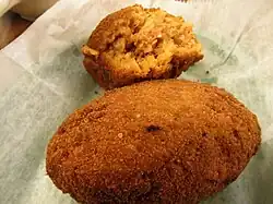 The deviled crab is prepared by slowly sautéing blue crab meat with a seasoning sauce made with tomatoes, onions, peppers, and various other flavors. This seasoning sauce is a version of a Cuban-style enchilada / sofrito sauce, known locally as "chilau".[1] Once most of the liquid is gone, the cooked crab meat is rolled in breadcrumbs (traditionally stale Cuban bread) and hand-formed into the approximate shape of a rugby football or small potato, then deep fried until brown.[2] Early versions of the recipe usually contained more spicy chili pepper than modern versions, thus giving them the appellation "deviled" in English.[1] As the croqueta's spiciness was toned down to account for a wider range of tastes, various pepper sauces became a common condiment utilized by those who liked their deviled crabs hot.[3][4]
