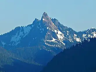 Devils Thumb is a 5,172-foot-elevation (1,576-meter) mountain summit in Snohomish County, Washington, United States. It is located near the western edge of the North Cascades, 10 miles south of Darrington, Washington, and 20 miles west of Glacier Peak which is one of the Cascade stratovolcanoes. The peak is situated on land administered by Mount Baker-Snoqualmie National Forest. The nearest higher neighbor is Devils Peak, 0.79 miles (1.27 km) to the southwest.[1] Precipitation runoff from the south slope of Devils Thumb drains into Coal Creek which is a tributary of the Stillaguamish River, whereas the other slopes drain into Helena Creek → Clear Creek → Sauk River. Although modest in elevation, topographic relief is significant as the summit rises over 2,100 feet (640 meters) above Helena Lake in one-half mile (0.8 km). This mountain's toponym has been officially adopted by the United States Board on Geographic Names.[3]