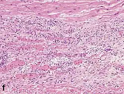 Although earlier changes can be discerned using electron microscopy, one of the earliest changes under a normal microscope are so-called wavy fibers.[23] Subsequently, the myocyte cytoplasm becomes more eosinophilic (pink) and the cells lose their transversal striations, with typical changes and eventually loss of the cell nucleus.[24] The interstitium at the margin of the infarcted area is initially infiltrated with neutrophils, then with lymphocytes and macrophages, who phagocytose ("eat") the myocyte debris. The necrotic area is surrounded and progressively invaded by granulation tissue, which will replace the infarct with a fibrous (collagenous) scar (which are typical steps in wound healing). The interstitial space (the space between cells outside of blood vessels) may be infiltrated with red blood cells.[22]